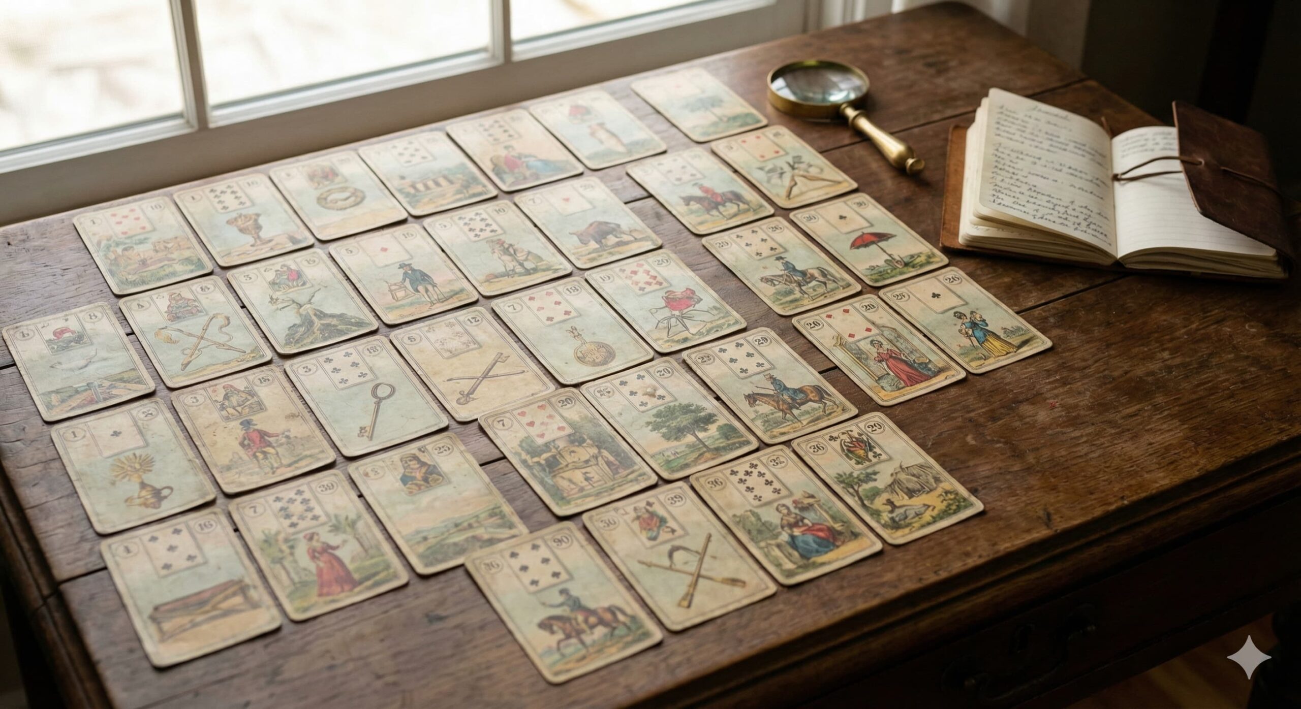 その情報量の多さから、中上級者向けとされていますが、読み方の手順を知っていれば初心者でも少しずつ試せます。ルノルマン占いの醍醐味ともいえる展開法で、多くの占い師が本格的なリーディングに使っています。